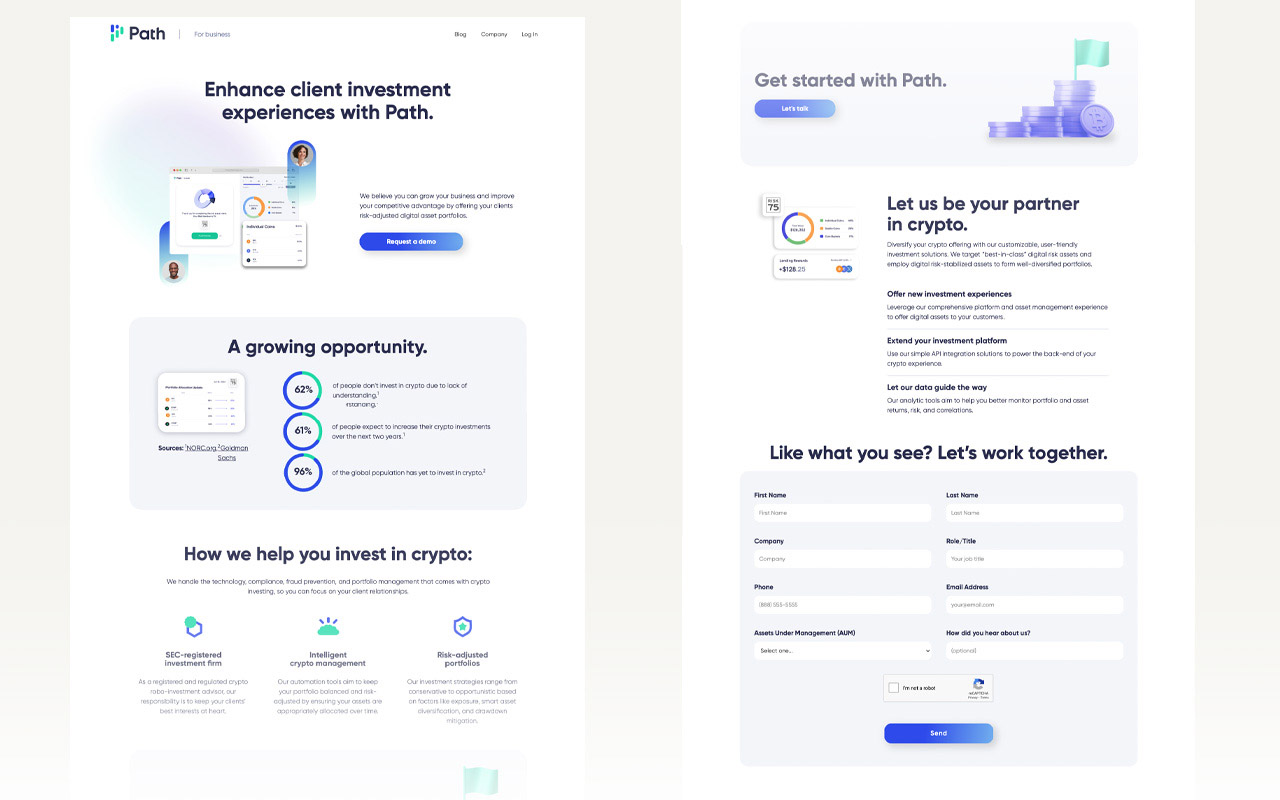 Path crypto is a fintech company providing solutions to help people that want to invest in digital assets reach their financial goals. We built the brand as an approachable advisor with a warm, fun, and refreshingly down-to-earth tone. The design structure is meant to be clear, simple, and intuitive to modernize the new approach to investing.